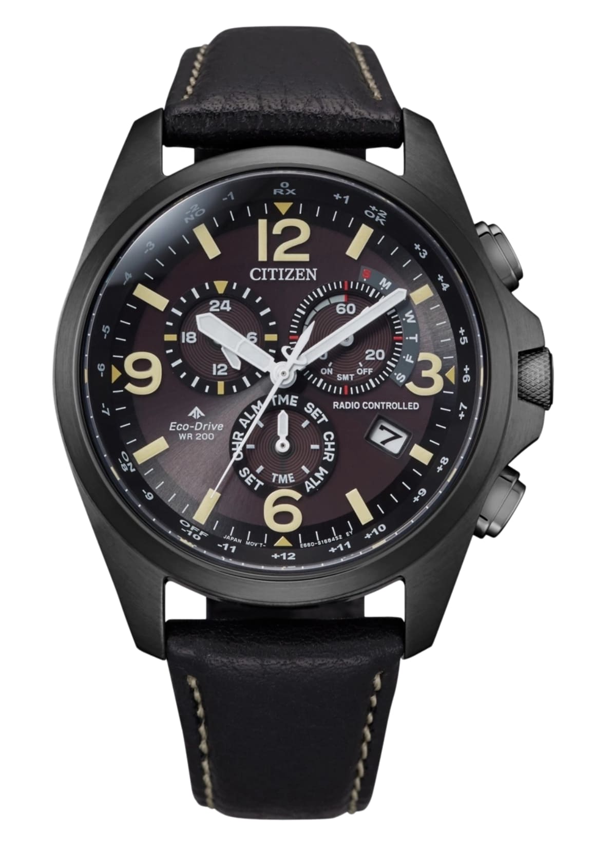 Citizen Herrenuhr Funkuhr Solar Saphirglas Schwarz Leder 20BAR CB5925-15E